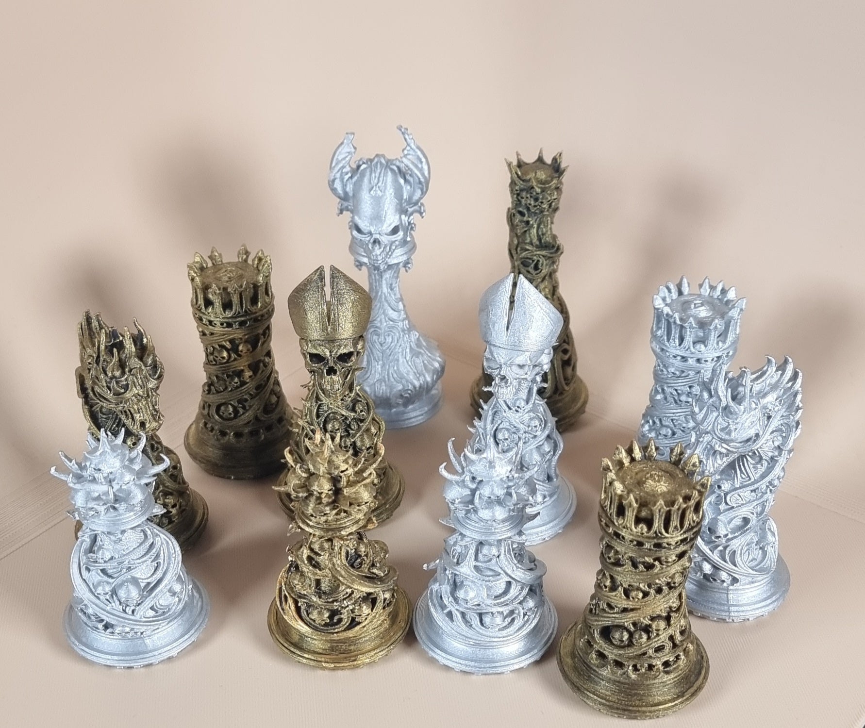 set di pezzi degli scacchi in stile con un'atmosfera dark e gotica. Adornati con spuntoni, teschi e tutto ciò che le menti oscure amano di più.